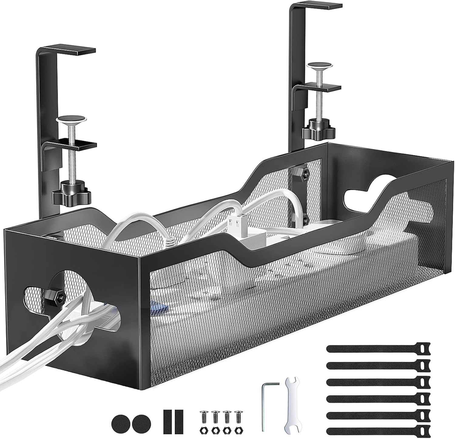 Constructed from high-quality carbon steel with a powder-coated finish, the tray features an open mesh design that allows for airflow, prevents dust buildup, and makes it easy to see and access your cables when needed. Each side of the basket includes two pre-drilled holes, enabling cables to pass through neatly from either direction. The clamp accommodates desks ranging from 0.4 inches to 2 inches thick, making it compatible with most standard office, gaming, or home desks.
